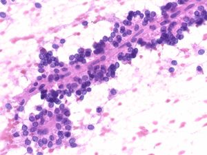 - Solid cellular smear pattern with or without branching and papillary cell clusters